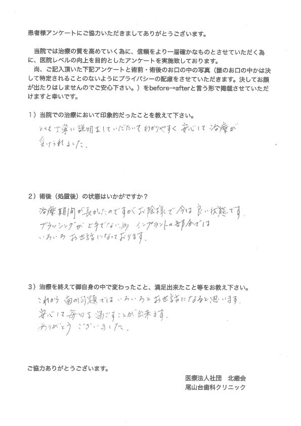 治療期間が長かったのですが、お陰様で今は良い状態です。ブラッシングが上手でない為、インプラントの部分ではいろいろお世話になっております。
